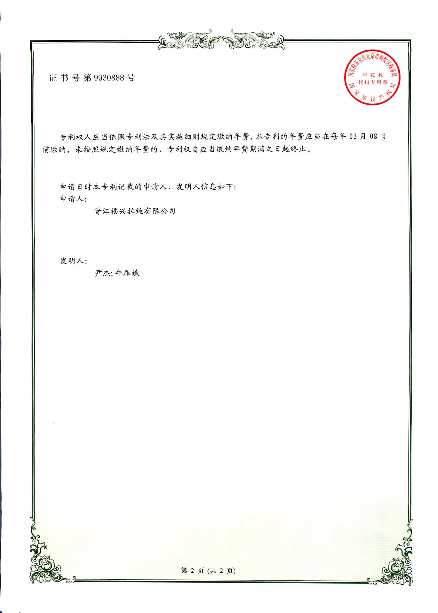 实用新型发明专利(第399943号)